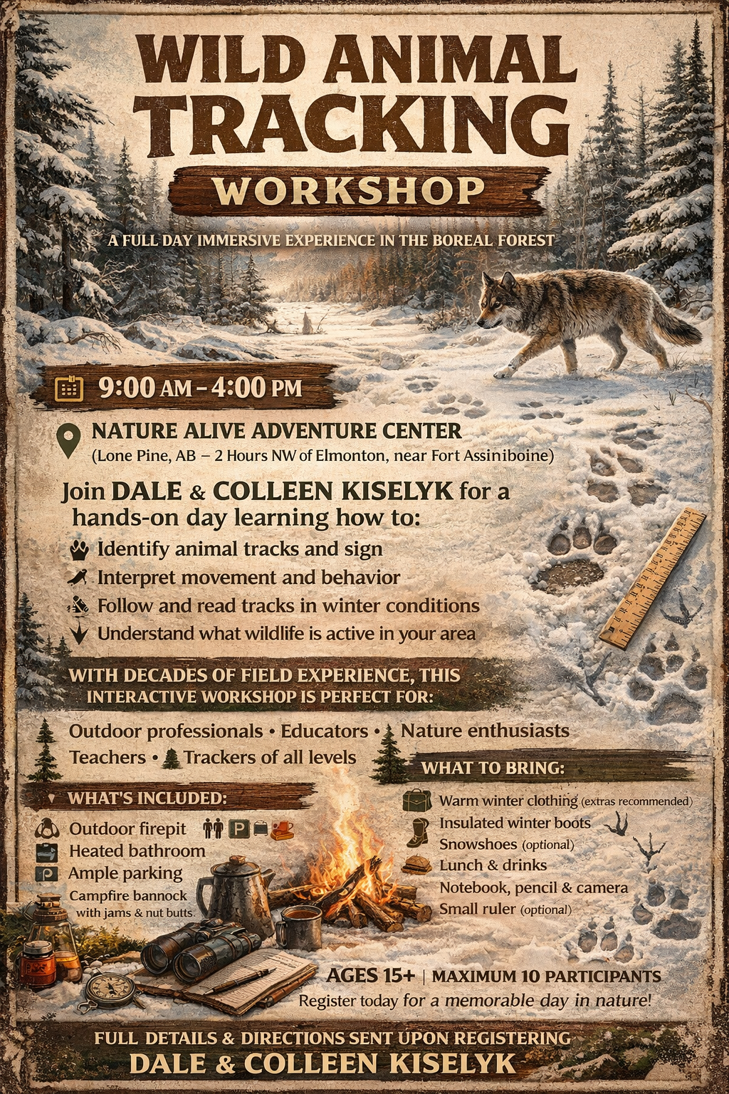 Location: Nature Alive Adventure Center(Lone Pine, AB) - 2 hours Northwest of Edmonton, near the Hamlet of Fort Assiniboine. Directions and full details on the workshop will be sent out to participants prior to the date.